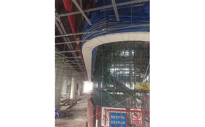 擋煙垂簾垂壁根據設計要求和現場實際情況采取如下施工順序:首先,搭設腳手架一放線一打眼--上脹栓一焊骨架。第二,吊件一安裝骨架…